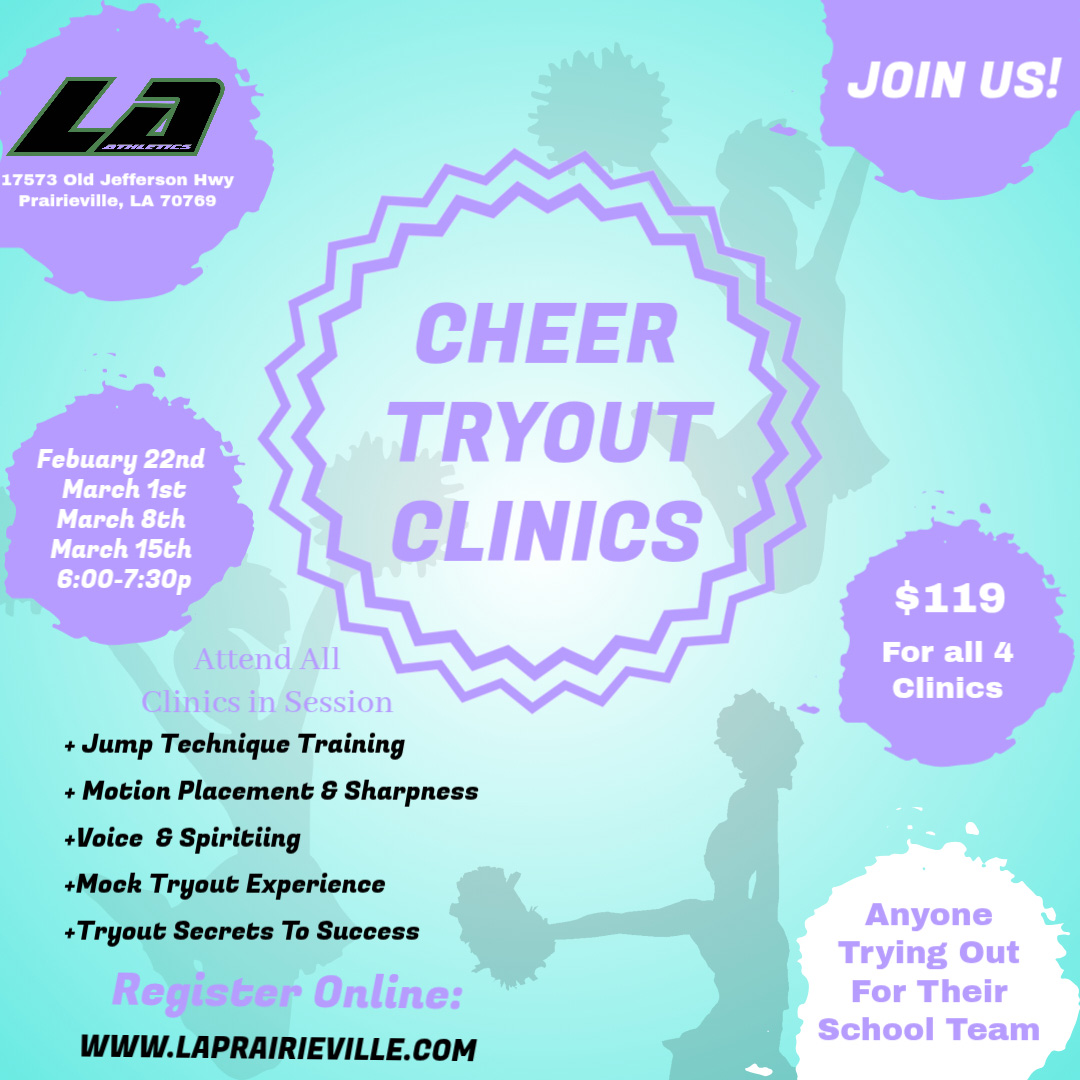 These clinics will help your cheerleader gain inside knowledge on how to perform during a tryout setting. Our instructors will coach you through the tryout process as well as help build confidence to thrive during your tryouts.